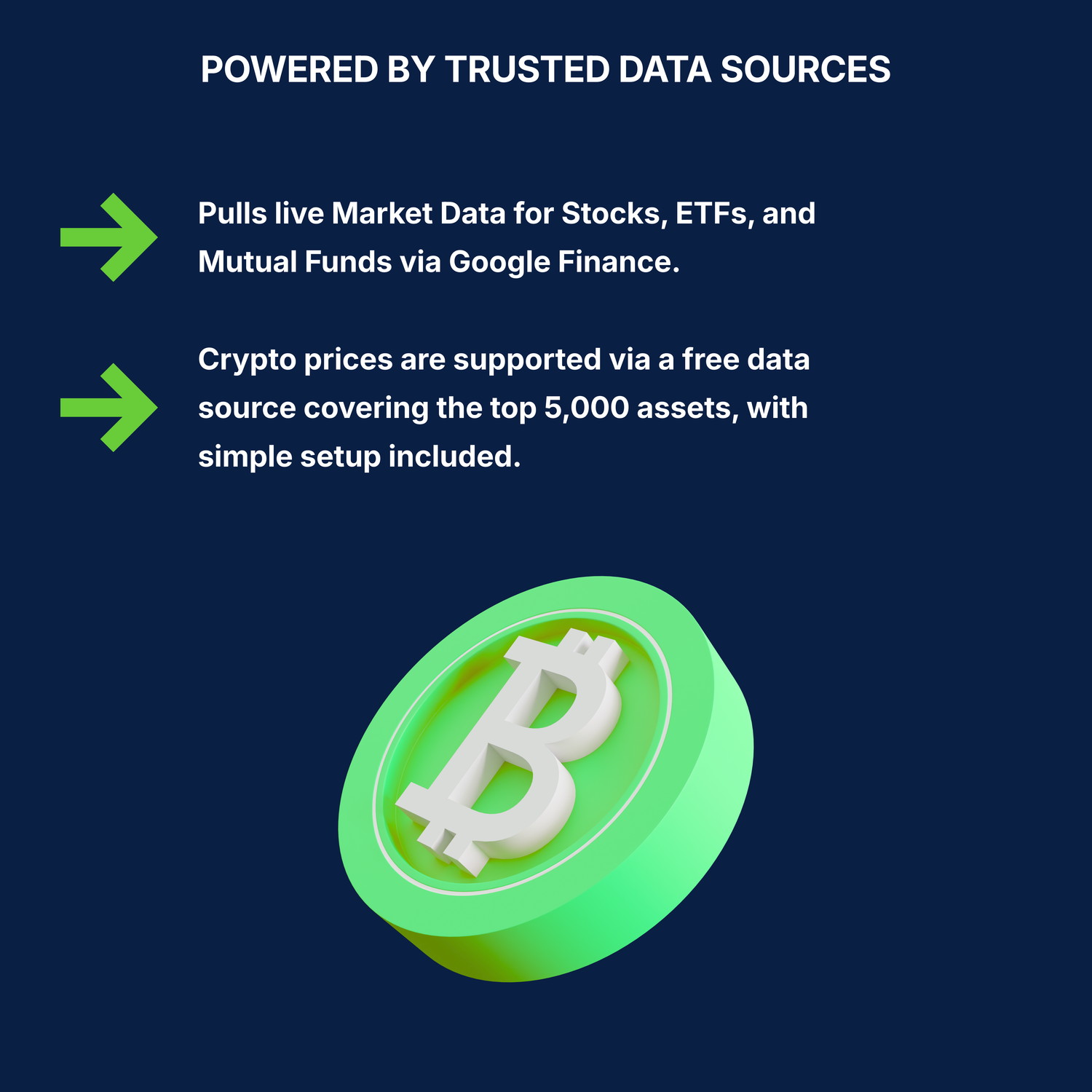 Automatically pull prices for thousands of stocks, ETFs, and mutual funds via Google Finance. Then enable crypto pricing with a free data feed for the top 5,000 cryptocurrencies. Setup is explained in the Instructions tab.