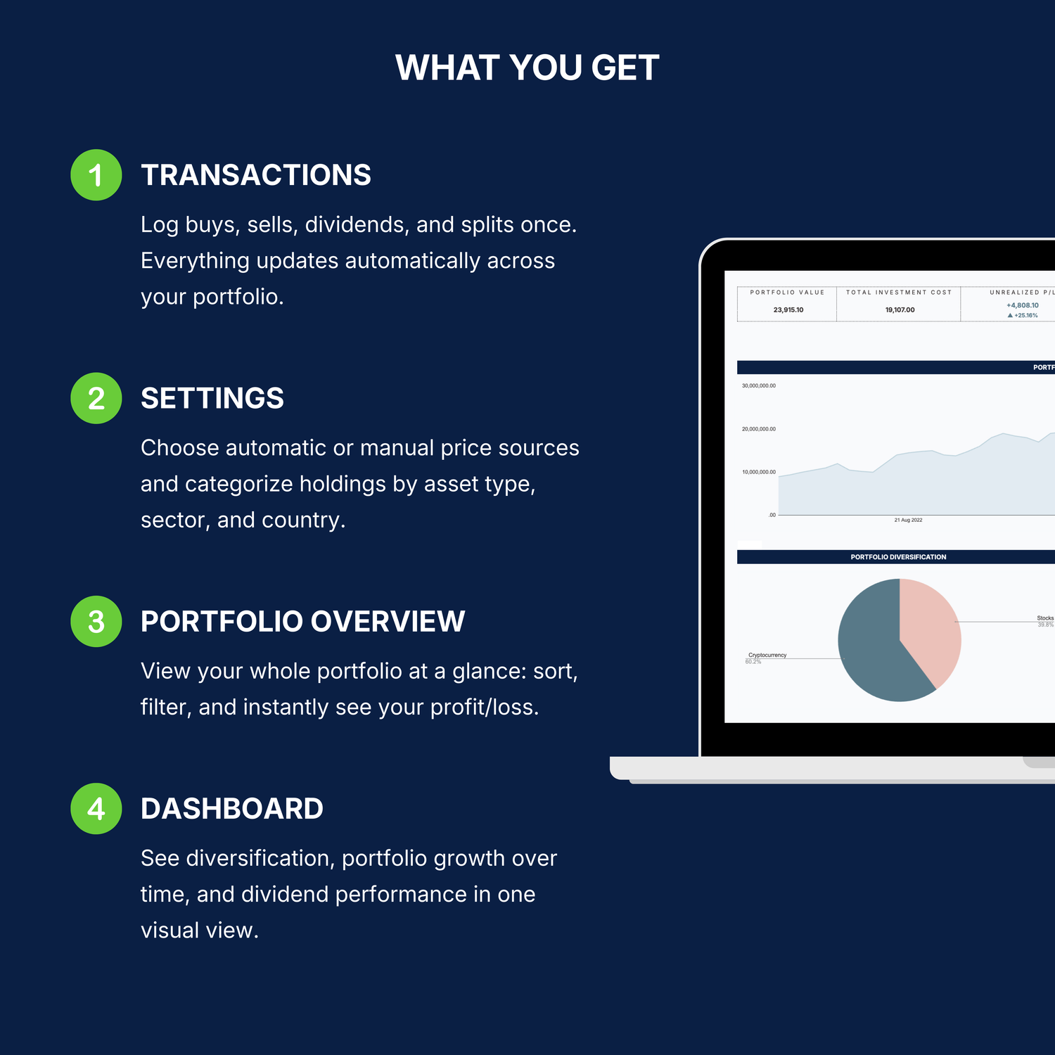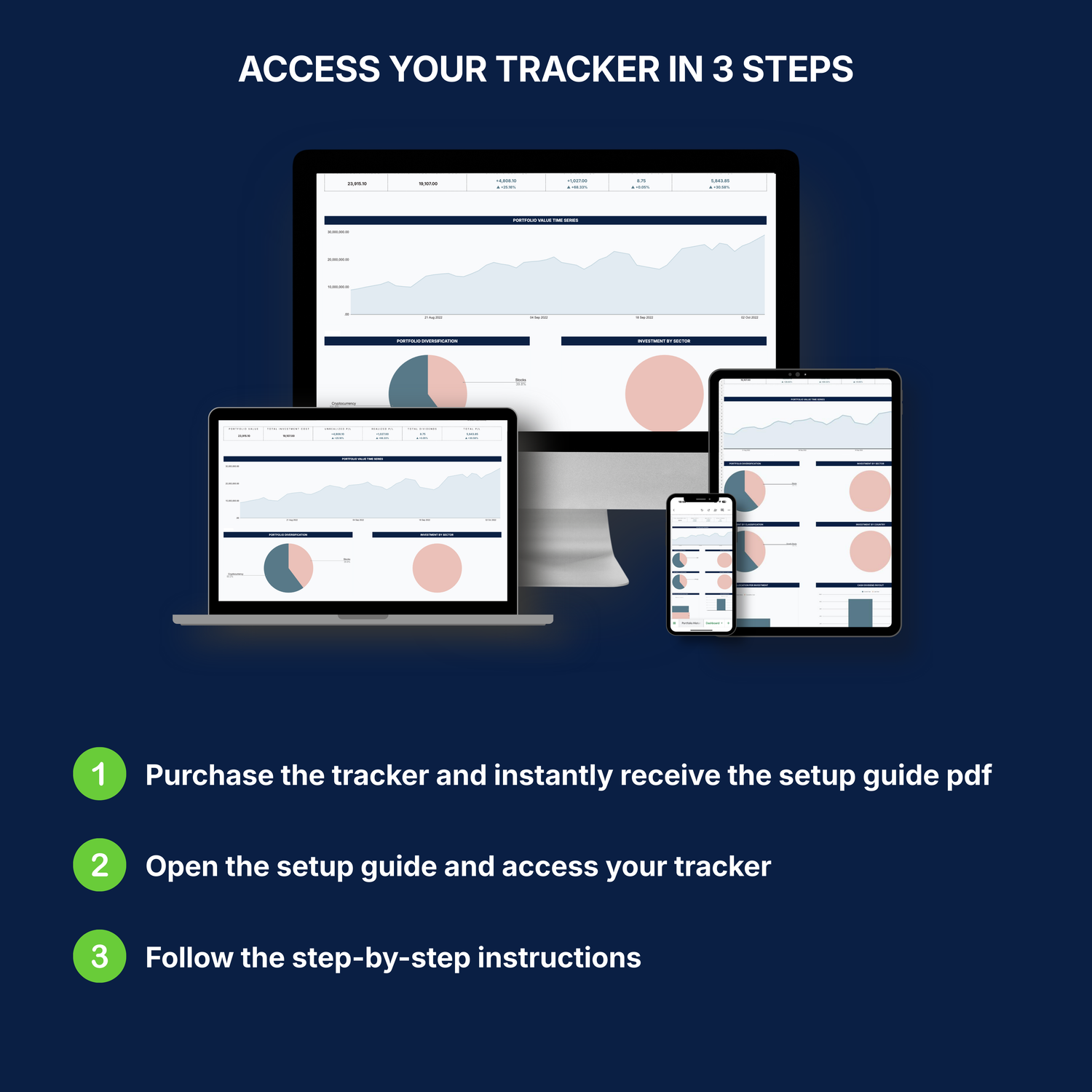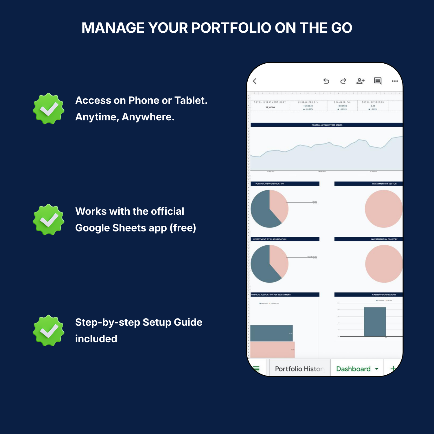 Manage your Portfolio and Monitor your Profits and Dividends on the go with the Sheets app. Instructions on how to set it up are in the Setup Guide PDF which you will instantly receive upon purchasing the tracker.